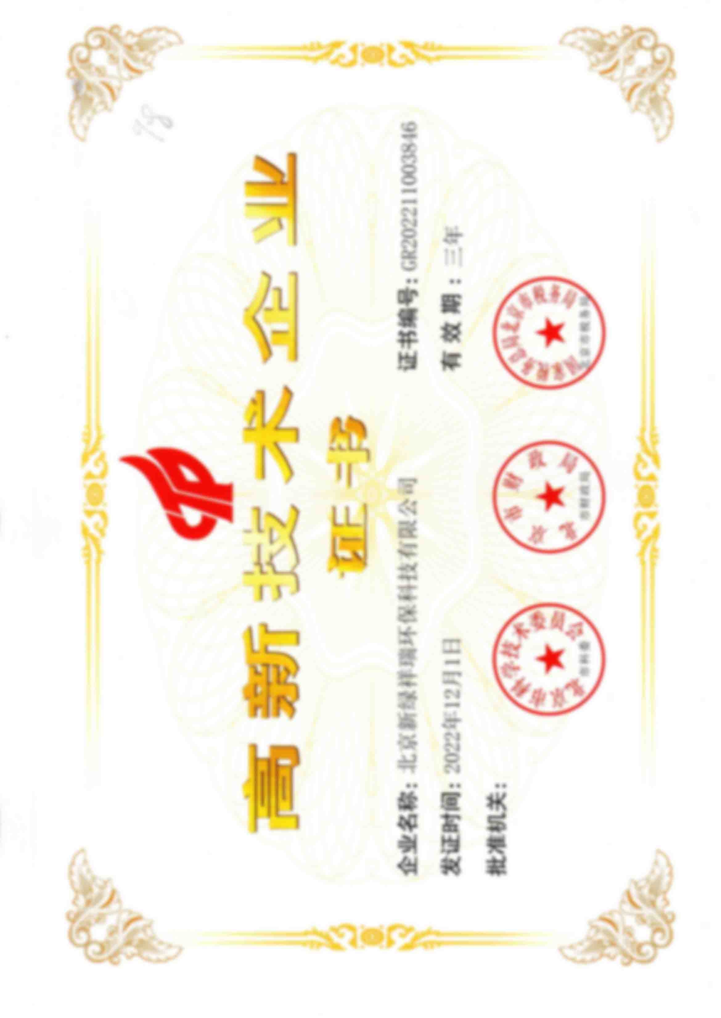 國家高新技術企業證書